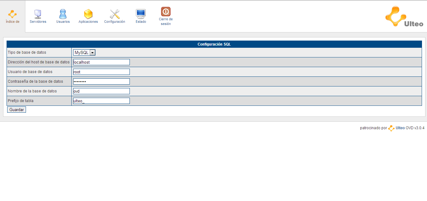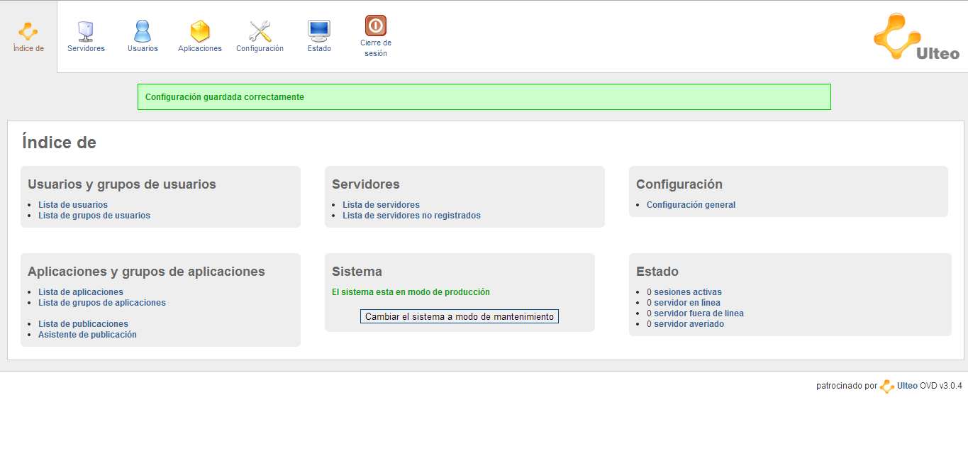 Una vez instalado entramos desde el navegador a la página de administración de ulteo con «IPserver/ovd/admin»