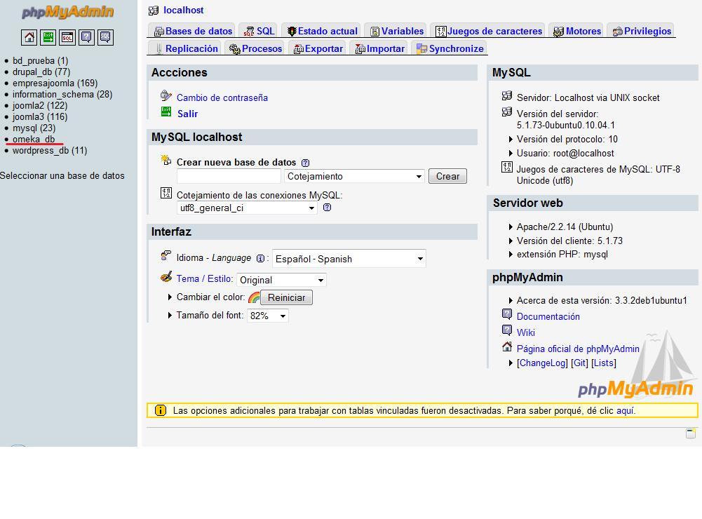 Una vez instalado pasamos a crear una base de datos (en phpmyadmin) para Omeka la cual llamaremos omeka_db