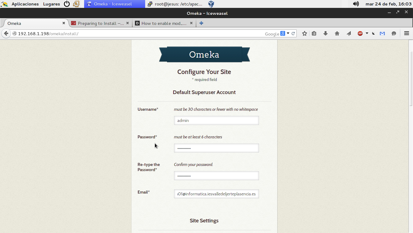 Tras esto, accediendo por el navegador a 192.168.1.198/omeka nos aparecerá el asistente de instalación. El cual nos pide datos como el nombre y la contraseña del usuario administrador, un email y el nombre del sitio que vamos a crear.
