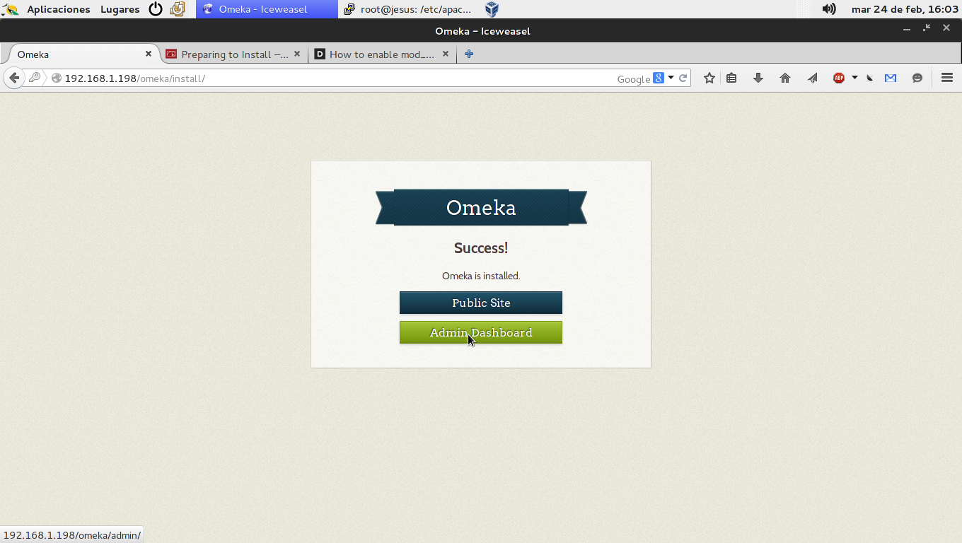 Los requesitos que nos pide Omeka en nuestra máquina son: Apache, MySQL (versión 5.0 o más), PHP e ImageMagick. Empezaremos por instalar ImageMagick ya que es el programa que falta en el servidor. La instalación es muy sencilla y en el enlace http://www.imagemagick.org/script/install-source.php (en inglés) encontraremos los pasos a seguir. Lo primero es descargar el archivo con el comando wget, luego accedemos a la carpeta ImageMagick-6.9.0, e introducimos los comandos ./configure(abrir el ejecutable) y make para configurar. Despues de esto procedemos a instalarlo intruduciendo sudo make install. Para terminar la instalación de ImageMagick, introducimos el comando make check que hará una comprobación de la propia instalación