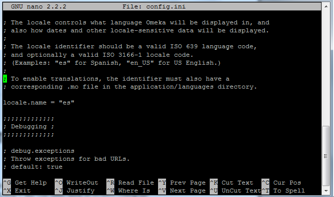 Cambiar el idioma omeka es muy sencillo y basta con acceder a la carpeta /var/www/omeka/application/config y alli con nano abrir el fichero config.ini