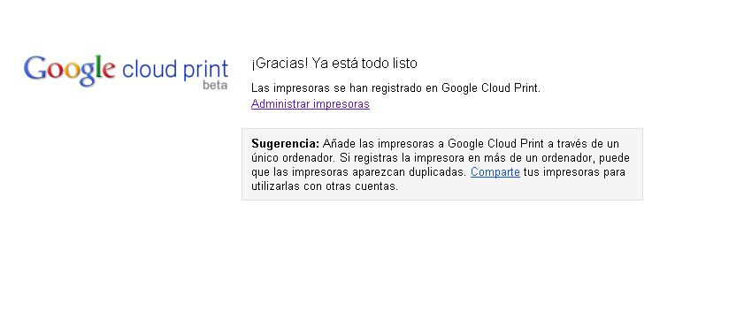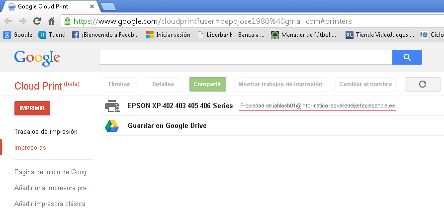 Ahora estamos dentro de Google Cloud Print y podemos gestionar nuestras impresoras y compartirlas. Una vez añadida, puedo conectarme desde cualquier dispositivo a mi cuenta Google e imprimir con mi impresora.