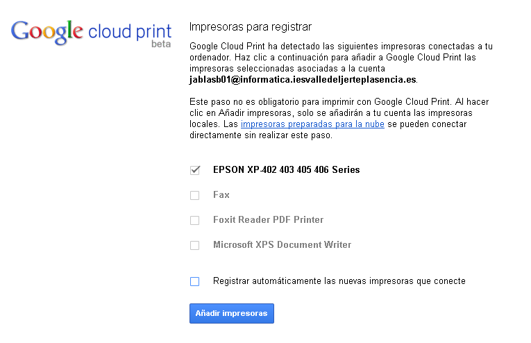 En la siguiente página elegimos la impresora que queremos asociar con Google Cloud Print y después pinchamos en Añadir impresoras. En mi caso sólo selecciono la Epson.