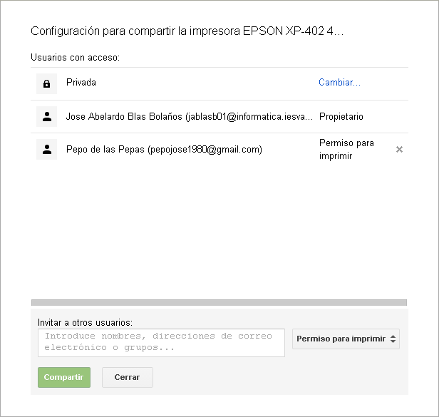 En la ventana que surge, abajo introducimos el/los correo/s que queramos dar permisos y elegimos también el tipo de permiso que le vamos a dar: sólo imprimir o también administrar la impresora.