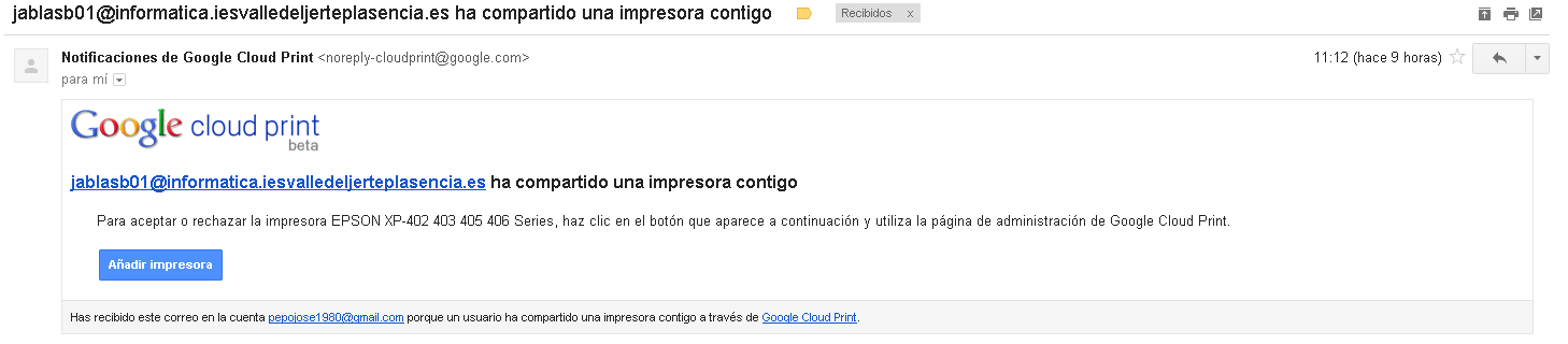 Una vez hecho todo esto, para probarla lo que hacemos es cerrar el navegador, encendemos la impresora y tenemos que tener encendido el ordenador. Lo siguiente que hay que hacer es entrar en el correo que hemos dado permisos y ver un correo que se nos ha mandado desde la otra cuenta que gestiona la impresora y confirmar para añadir la impresora.