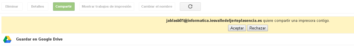 También puedo dar permisos a otras cuentas de Google para que puedan utilizar mi impresora. Pinchamos una vez encima de la impresora que queramos compartir y pulsamos el botón de arriba de color verde que pone Compartir.