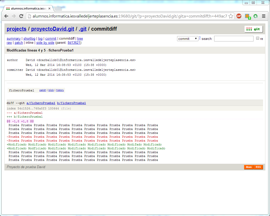 Y con la opción commitdiff podremos ver que se ha modificado exactamente, tanto lo que se ha añadido (verde) como lo que se ha eliminado (rojo):