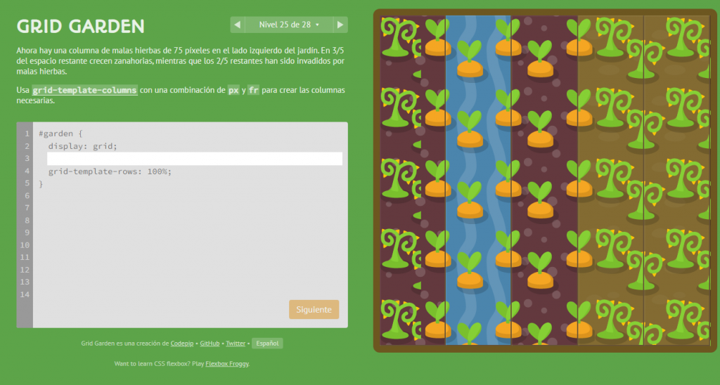 En Grid Garden nuestro objetivo es regar nuestros cultivos con agua y deshacernos de las malas hierbas con barro. Para ello, usamos las funciones Grid de CSS, con propiedades como grid-column-start y grid-column-end.