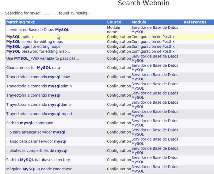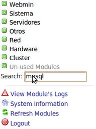 Lo primero que realizaremos al abrir Webmin, será en el menú de la izquierda,en la opción del buscador (search),escribiremos: mysql