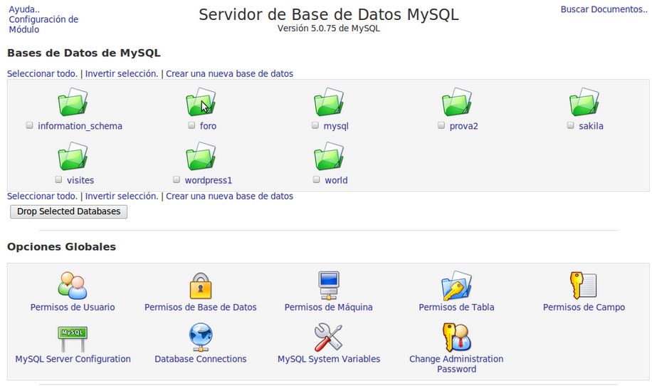 Al aceptar nos saldrán todas las opciones relacionadas con mysql,en nuestro caso seleccionaremos la primera de ellas (opciones de mysql):