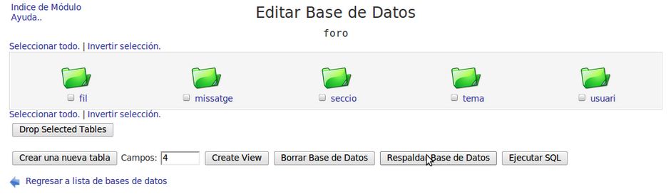 En esta nueva ventana veremos las tablas que hay creadas,y debajo una serie de opciones. Seleccionamos la opción Respaldar Base de Datos y entramos en la página del backup: