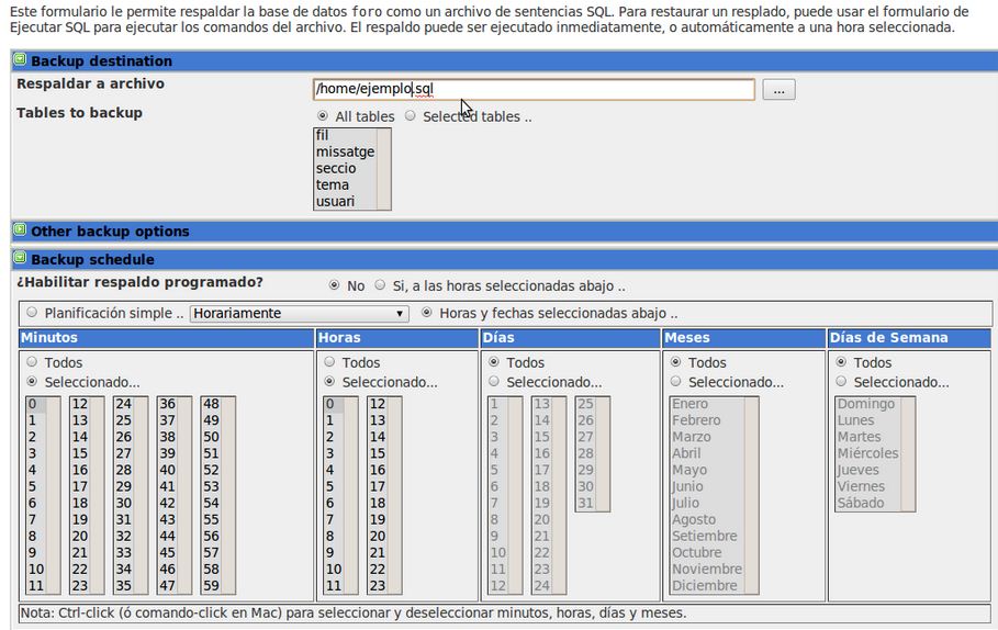 En esta nueva página del backup aparecen muchas opciones; En la opción Respaldar a archivo le indicaremos la ruta donde lo vamos a guardar (ej:/home/ejemplo.sql). Una vez hecho esto,le damos a Respaldar y nuestra Base de Datos quedaría guardada.
