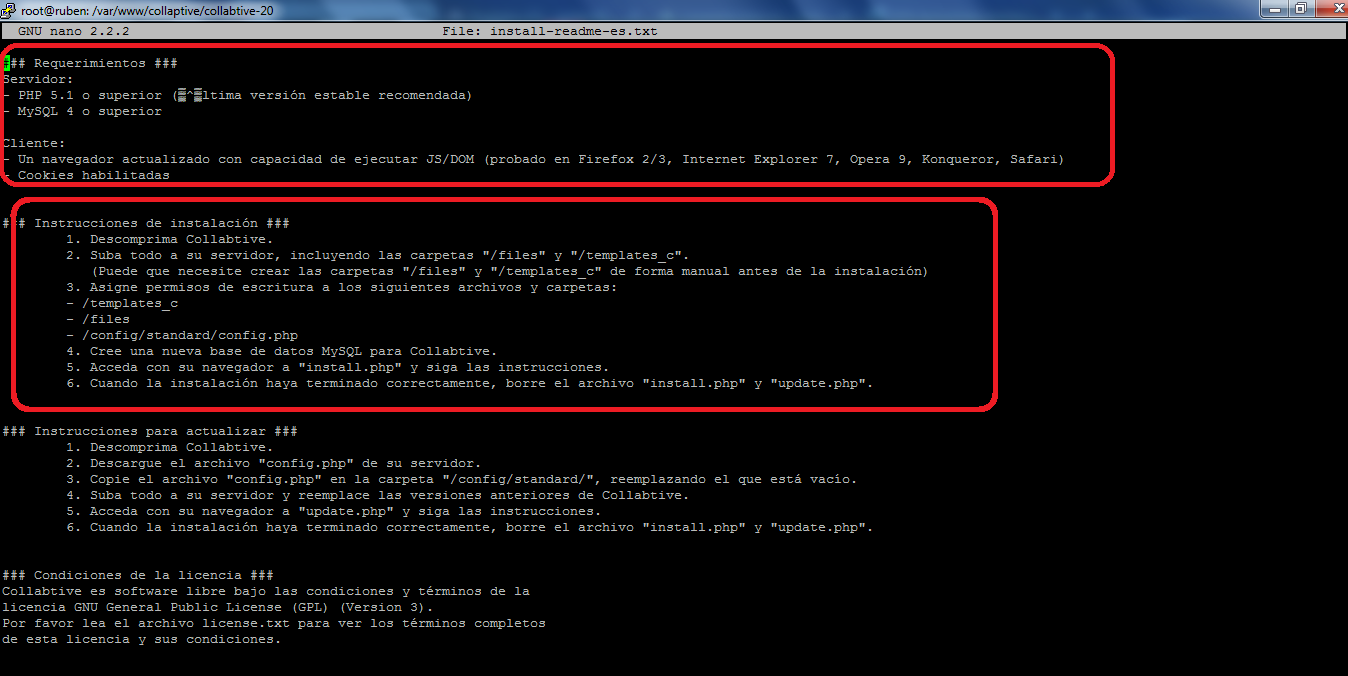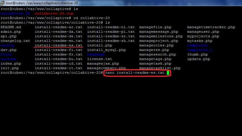 Una vez lo tenemos en el servidor buscamos el archivo y lo descomprimimos, vemos que se ha creado una carpeta denominada collabtive-20 (o con nombre similar) que es la que contiene todos los archivos para poder instalar esta aplicación, entramos en ella y observamos su contenido, una vez dentro buscamos el archivo install-readme-es.txt ya que es el que contiene tanto las condiciones como los pasos que debemos seguir para poder instalar Collabtive, nos fijaremos en la ultima sílaba antes del punto de este tipo de archivo para identificar el idioma en que lo queremos leer. Vemos dicho documento: