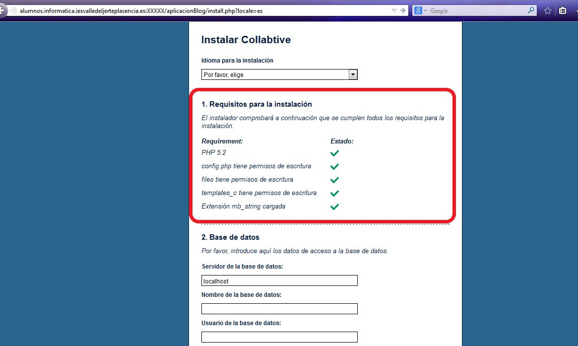 Una vez que hemos creado la base de datos, accedemos al navegador a la ruta donde tengamos la carpeta que contiene collabtive y cargamos el archivo install.php y realizamos la instalación, que es muy sencilla e intuitiva. Como podemos observar en las siguientes capturas de pantalla: