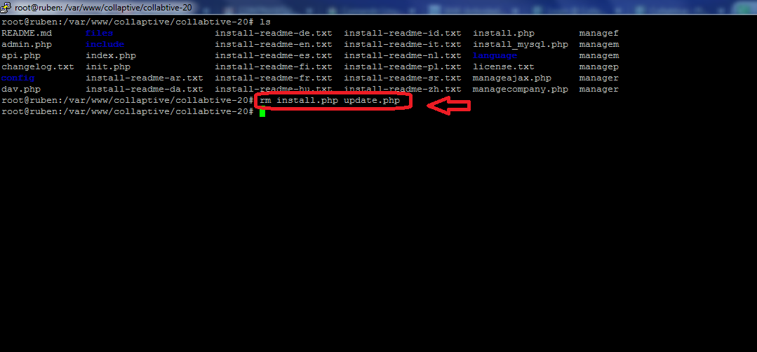 Al concluir la instalación no sale un mensaje de que se realizó con éxito, seguidamente, entramos en el servidor y borramos los archivos install.php y update.php para no tener problemas posteriores con la aplicación.
