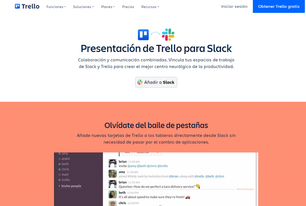 Para vincular Trello con Slack, debemos de hacerlo desde la aplicación de Trello para Slack. Esta aplicación hace que sea muy sencilla la administración de tarjetas en los tableros, cambiar fechas de finalización y adjuntar conversaciones a tarjetas desde la interfaz de Slack