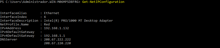 Para comprobar toda la configuración escribimos Get-NetIPConfiguration :