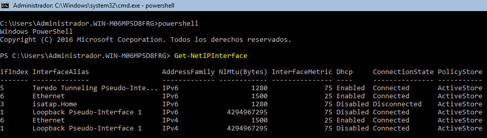 - Ejecutamos el comando Get-NetIPInterface para identificar las interfaces de red que vamos a configurar.