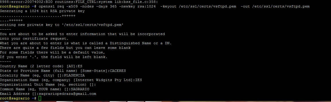 Lo primero será generar un certificado que almacenaremos en /etc/ssl/certs/vsftpd.pem y le daremos un tiempo de vida de un año (365 días). En ssl/certs es donde se encuentran todos los certficados.