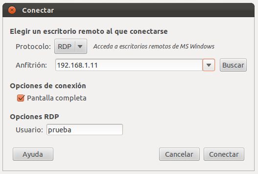 Escogeremos la opción de protocolo «RDP» (para conectar a escritorios Windows) y deberemos conocer la dirección IP del equipo al que nos queremos conectar (la cual pondremos en «Anfitrión») y el Usuario con el que conectarnos (en mi caso el usuario «prueba»).