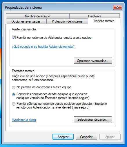 En primer lugar deberemos permitir el acceso remoto a nuestro Windows. Panel de control>sistema y seguridad>permitir acceso remoto. Una vez en la siguiente ventana, en la parte de Escritorio Remoto, seleccionaremos la 2º opción debido a que conectaremos desde un Linux y seleccionamos el usuario al que permitiremos conectarse.