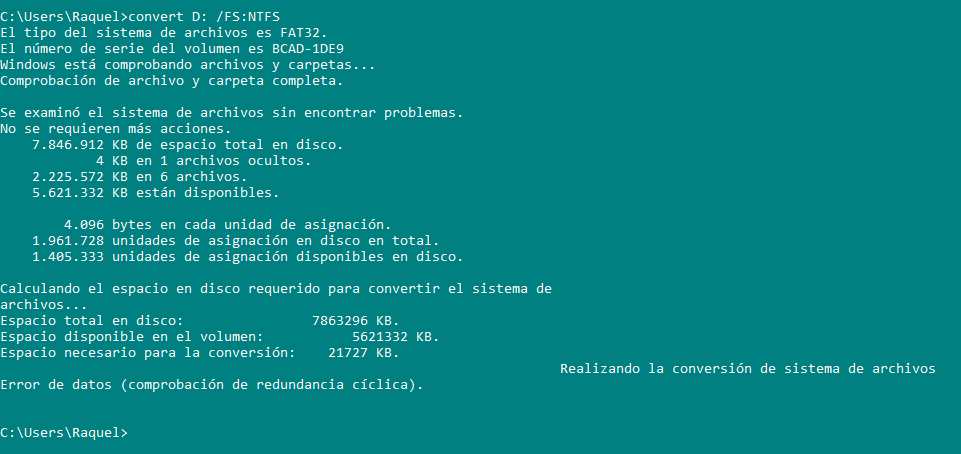C:\Users\Raquel>convert D: /FS:NTFS