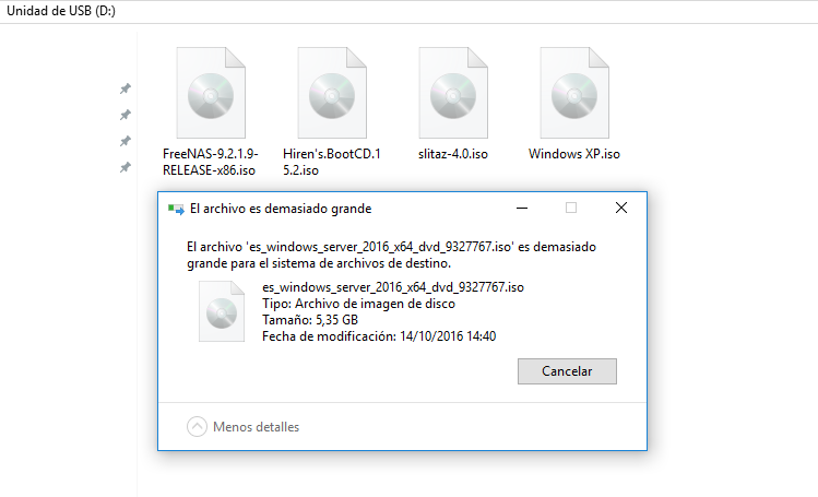¿A qué es debido? Este error se debe a que el USB, en este caso un sistema de archivos FAT32, no soporta ficheros mayores de 4GB.