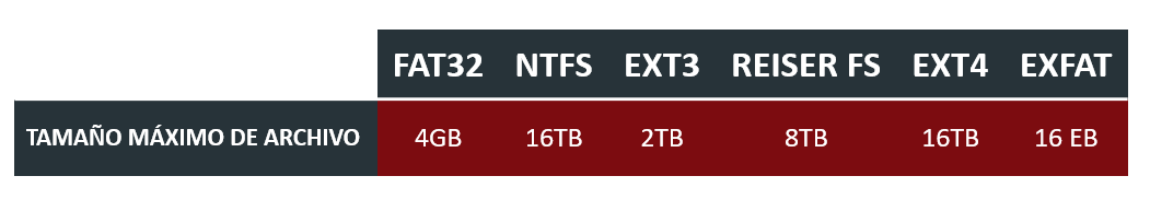 A continuación, se muestra una tabla con los tamaños máximos que soportan los sistemas de ficheros más conocidos: