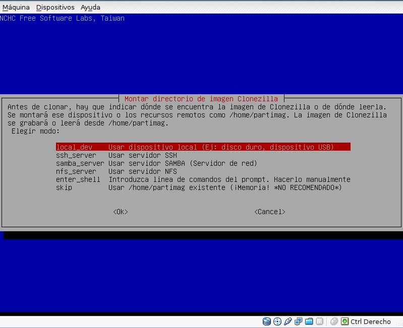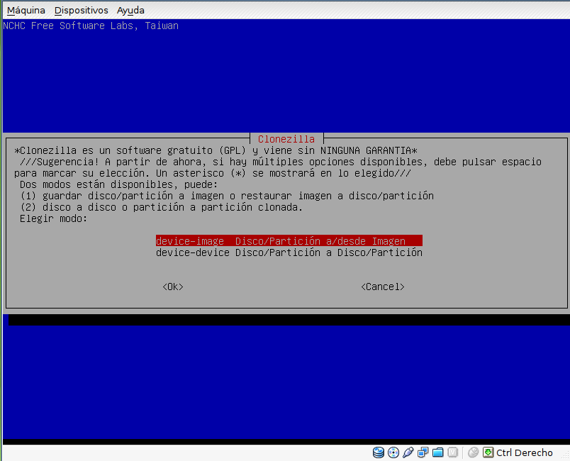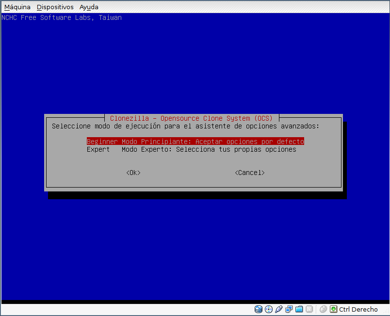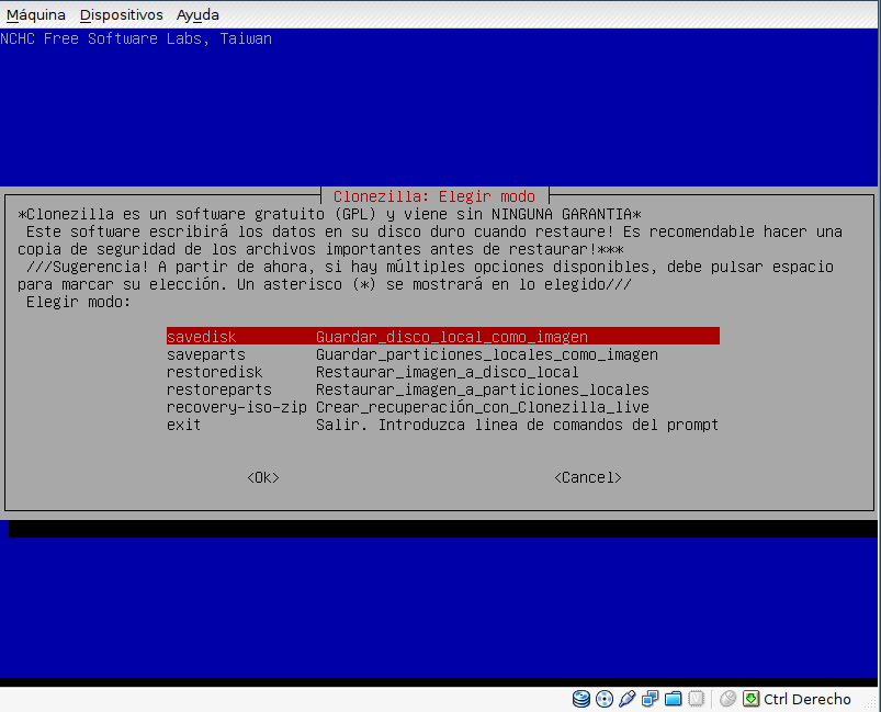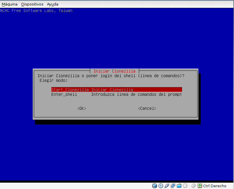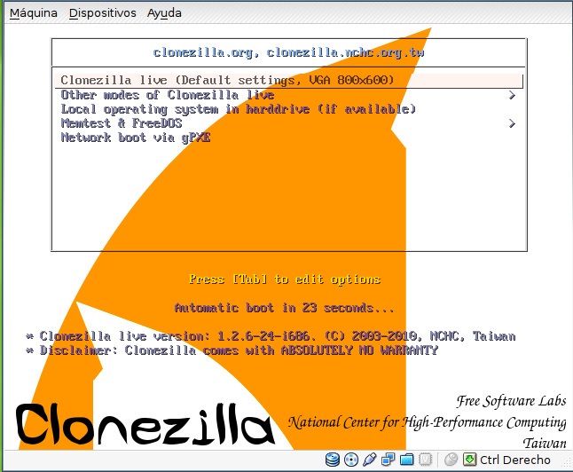 Lo primero es iniciar el ordenador desde la unidad óptica para que nos cargue el Clonezilla, (boot menu o bios).
