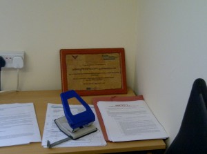 Después de comer somos llamados al despacho de Martins, Donde consigo echar la foto de la placa que los dimos.