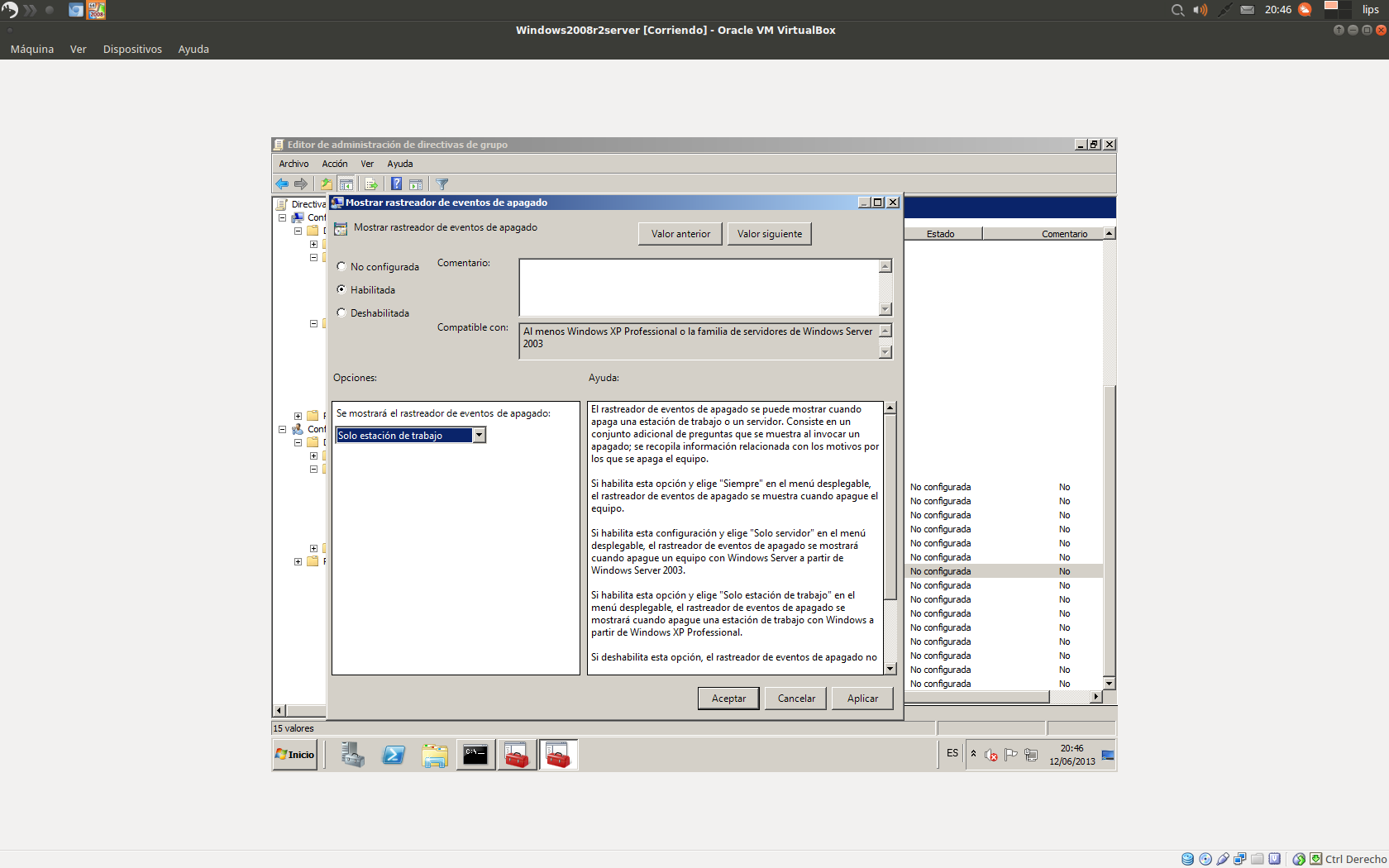 Esta directiva se encuentra en [ Configuración del equipo – directivas – plantillas administrativas – sistema ] y se llama «Mostrar rastreador de eventos de apagado» y al activarla tenemos un menú desplegable en el que podremos poner que solo se aplique en el server (si la tenemos desactivada por defecto se aplica igualmente al server) o en los equipos.