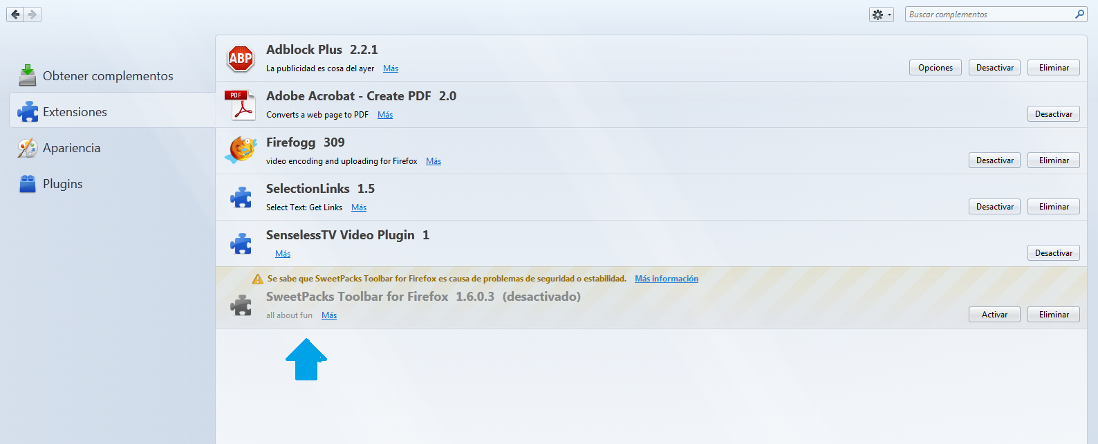 - Una vez realizado el paso anterior nos vamos a Firefox y en complementos nos metemos en las extensiones y eliminamos todas las relacionadas con el software maligno.
