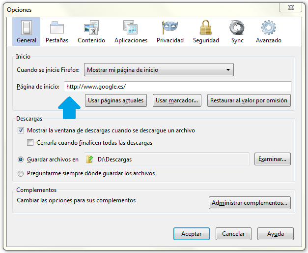 4.Cambiamos en las opciones de Firefox la página de inicio, quitando la del software malicioso y poniendo la deseada.