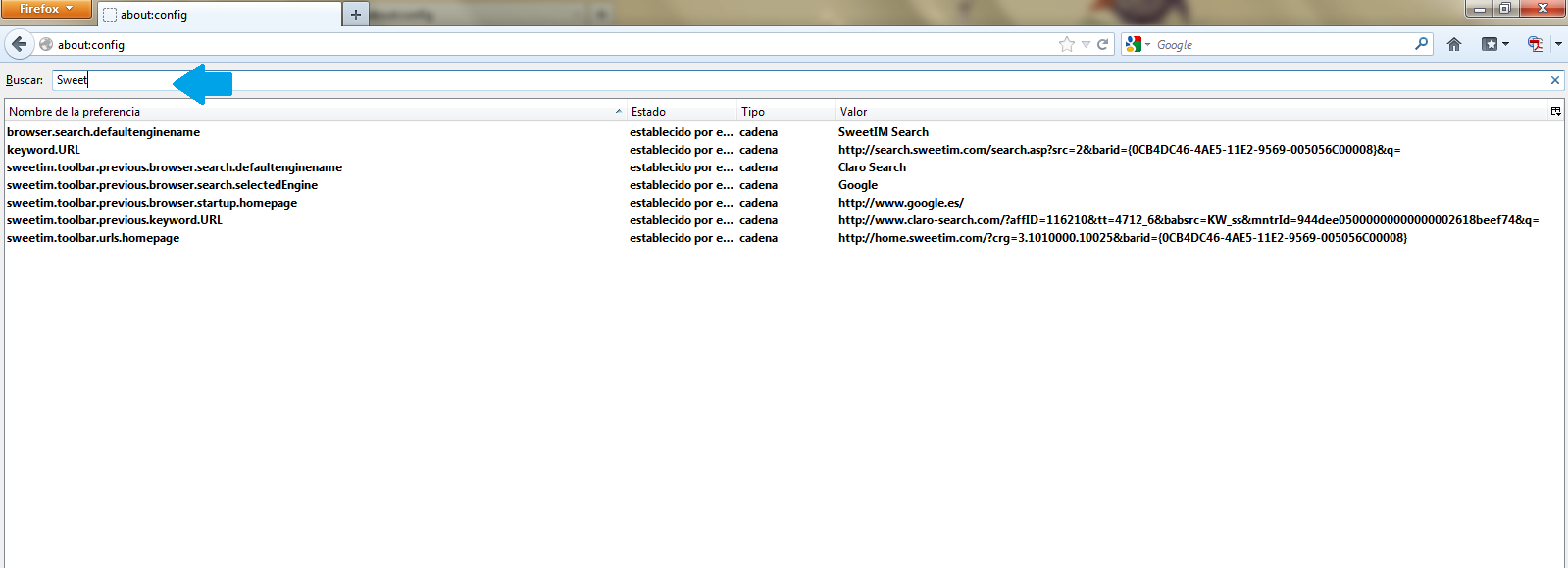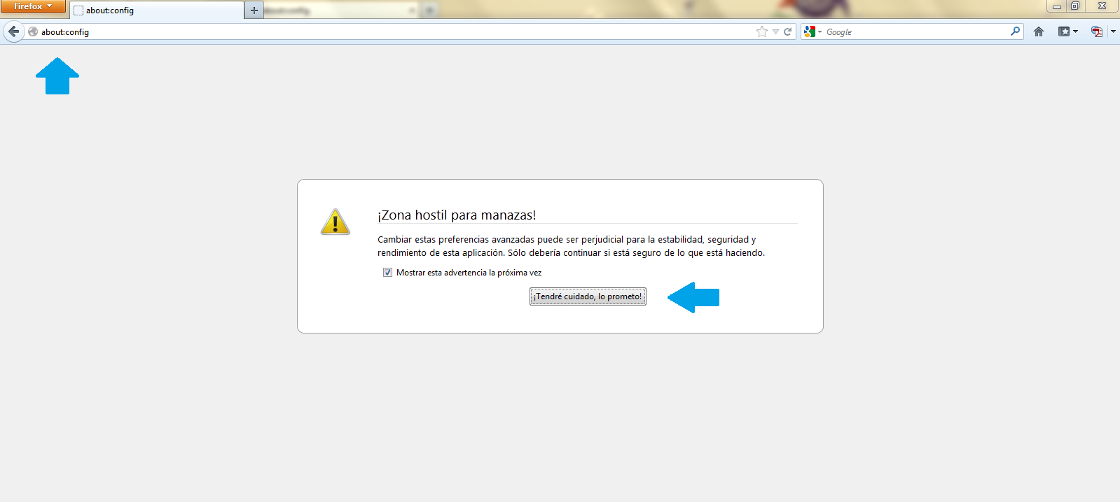 5.Una vez realizado todo esto creemos que lo hemos quitado por completo, pero resulta que queremos realizar una búsqueda desde la línea de direcciones del navegador y el buscador sigue siendo el software malicioso. Lo que debemos hacer es ir a el navegador, y en la barra de direcciones ponemos: about:config, y nos aparece un mensaje de peligro, diciéndonos que nos vamos a meter en las opciones avanzadas y que tengamos cuidado, pinchamos en tendré cuidado, lo prometo!. Después, nos aparece un listado que nos da la opción de reestablecer la configuración por defecto, que es lo que nos interesa, ya que es aquí donde buscaremos el software que deseamos eliminar, poniendo su nombre en la barra buscar y una vez localizado pinchamos sobre el con el botón derecho del ratón y le damos a reestablecer.