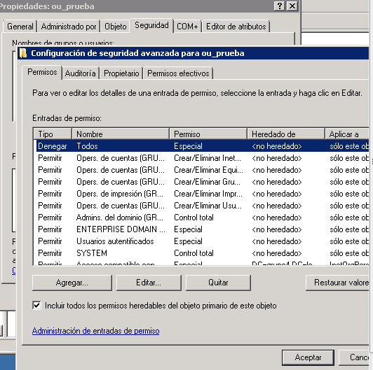 5º Una vez dentro desmarcamos las opciones «eliminar» y «eliminar subarbol» así ya tendremos permiso para borrar la unidad organizativa.