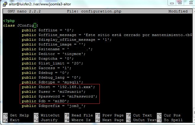 Y ahora en el archivo de Joomla configuration.php modificaremos las siguientes opciones: