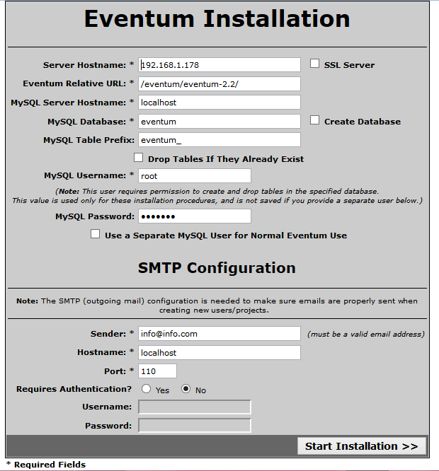 La instalación es sencilla, tras descargar el paquete y descomprimirlo en el servidor, sólo tenemos que rellenar la siguiente ficha en el navegador: