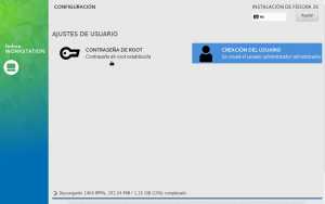 Paso 4. Esperar a que se instale. Mientras se instala nos dan la opción de crear un usuario y de ponerle contraseña al root.