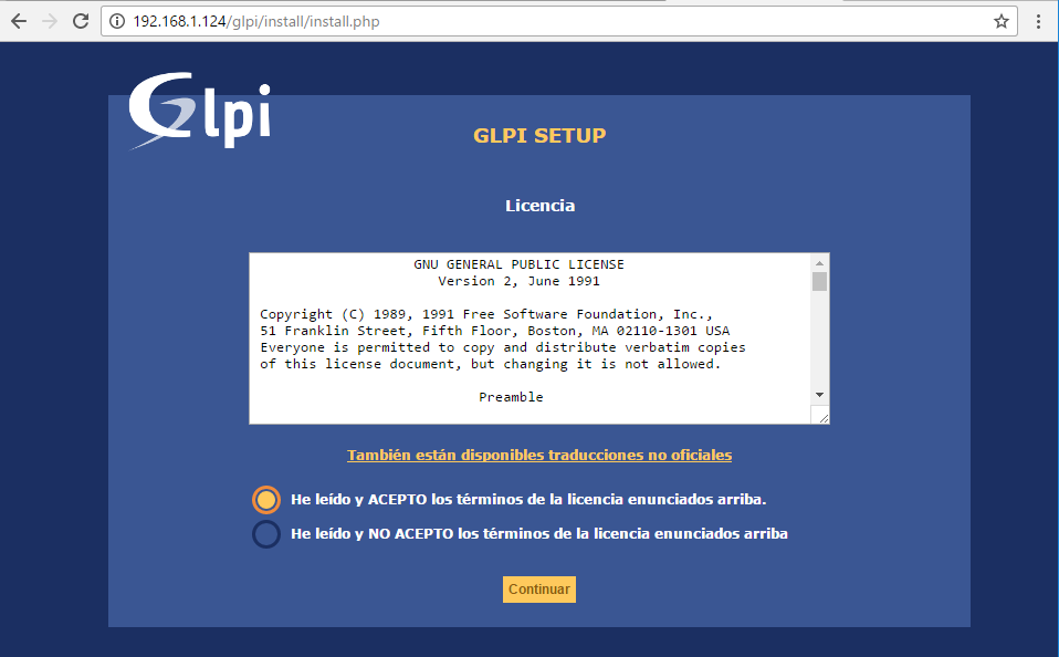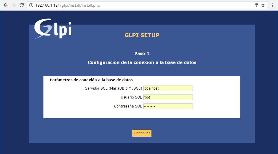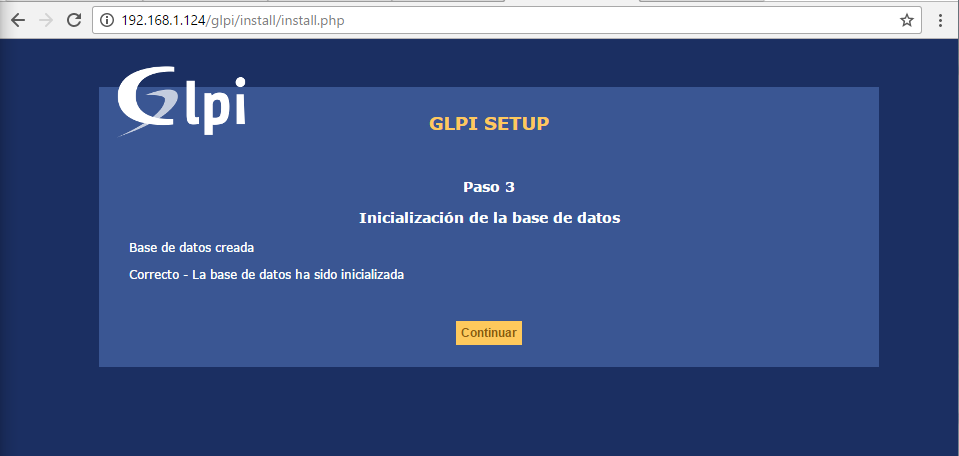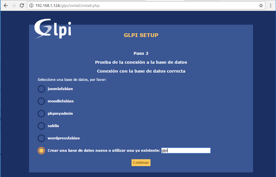 6–>Si tenemos ya una base de datos creada para ello saldrá en la lista que se muestra a continuación o si no la tenemos creada podemos crearla desde este mismo paso indicando el nombre de la nueva base de datos para GLPI