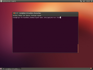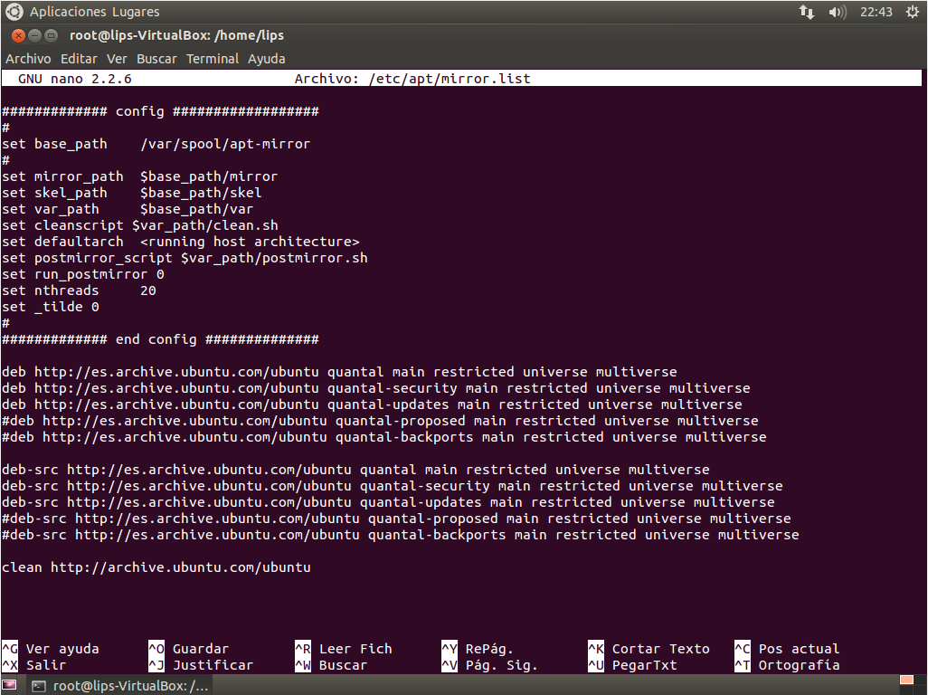 3º-Ahora editaremos el archivo mirror.list , en el están los archivos de configuración donde se bajaran los archivos, paquetes, etc para el repositorio, lo editaremos y quitaremos ciertos # para que dejen de ser comentarios, lo debemos dejar tal y como está en la imagen, lo más destacable es la 3º línea que es donde se van a almacenar los archivos
