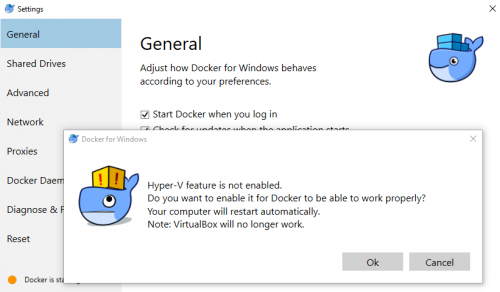 Hace unos días quise instalar docker en mi máquina física de Windows 10, en la que utilizo VirtualBox, para las prácticas de clase. Al instalarlo me saltó el siguiente mensaje: