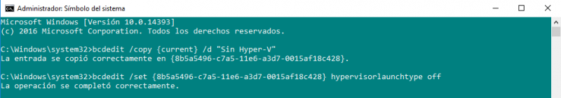 A continuación, ejecutaremos otro comando, que lo único que va a hacer es deshabilitar el arranque del hypervisor para la nueva entrada duplicada anteriormente.