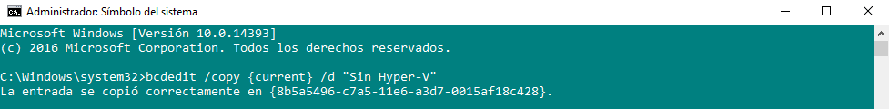 C:\Windows\system32>bcdedit /copy {current} /d «Sin Hyper-V»