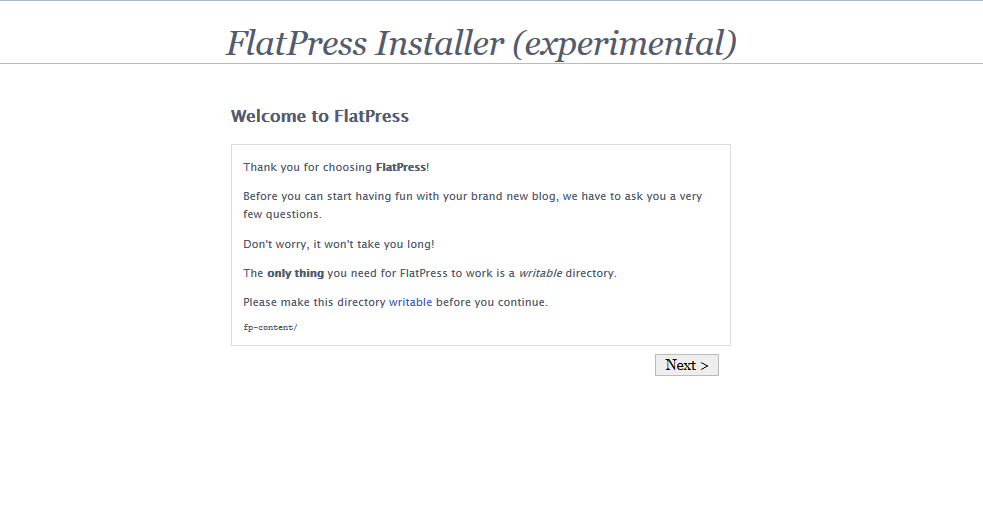 Para continuar, debemos darle permisos al servidor web para que pueda escribir en el directorio de Flatpress y así podrá continuar la instalación: