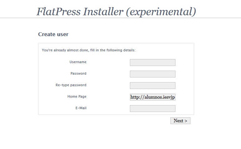 Mediante la orden chown -R www-data:www-data Flatpress le doy permisos y pulso next.