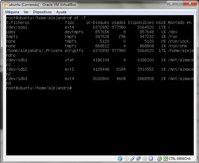 Cuando están montados podremos visualizar la información de los sitemas de ficheros con el comando df -T
