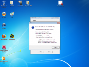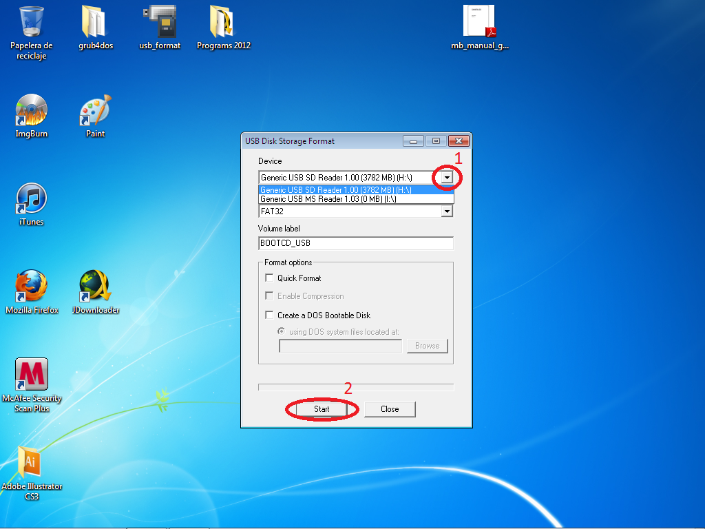 Nos descargamos los dos programas y primero arrancamos el USBform para dar forma al USB. Primero seleccionamos el dispositivo a dar el foramto y despues le damos a comenzar. Esto nos llevara un ratico.