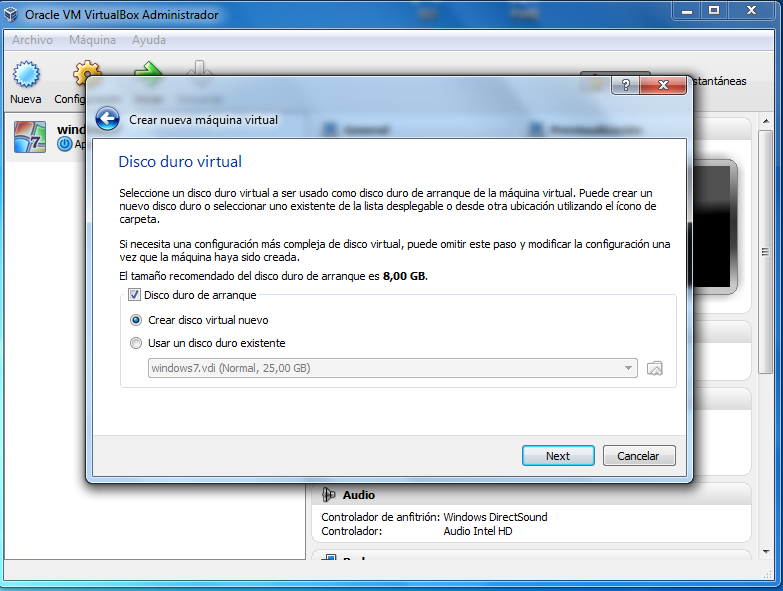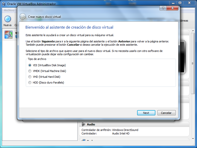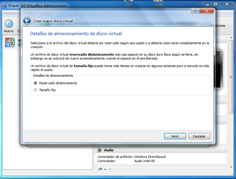 Vamos a crear un nuevo disco virtual y le damos a nuevo. Elegimos el tipo de archivo VDI y almacenamiento reservado dinámicamente.