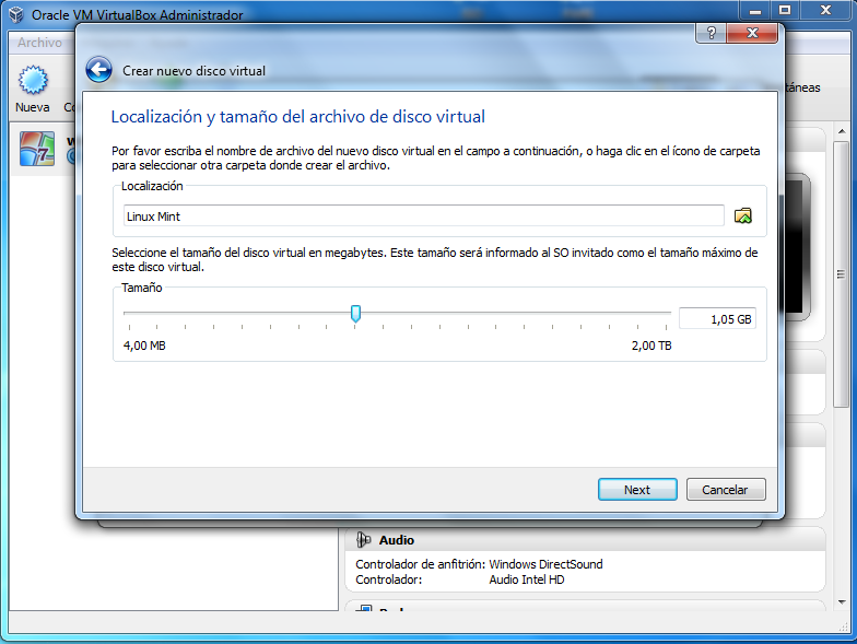 Ahora le decimos donde queremos guardar el archivo y despues le asignaremos el tamaño de disco virtual. En este caso le asignaré 1Gb.