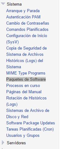 Tras acceder a Webmin a través de tu puerto (en mi caso el 21910), nos vamos al apartado Sistema>Paquetes de Software.